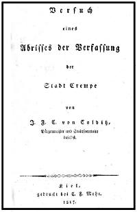 Verfasser dieses Werks war Hans Friedrich Carl von Colditz, Bürgermeister und Stadtsekretär von Krempe (1812-1818), geboren am 16.06.1786 in Schleswig.Die Verfassung wurde 1817 vom Autor veröffentlicht im 3. Heft der Schl. Holst. Lauenb. Prov. Ber., Jahrgang 1817 sowie in einem Sonderdruck von C.F. Mohr, Kiel. - Den Sonderdruck bereitete Ulf Steinhauer zur PDF-Datei auf und stellt ihn auf crempa.de der öffentlichen Kenntnisnahme zur Verfügung.